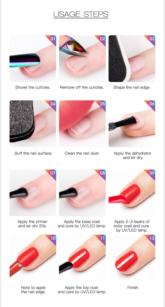 10. Apply two layers of activator evenly on the nail surface(air-dry 5s).