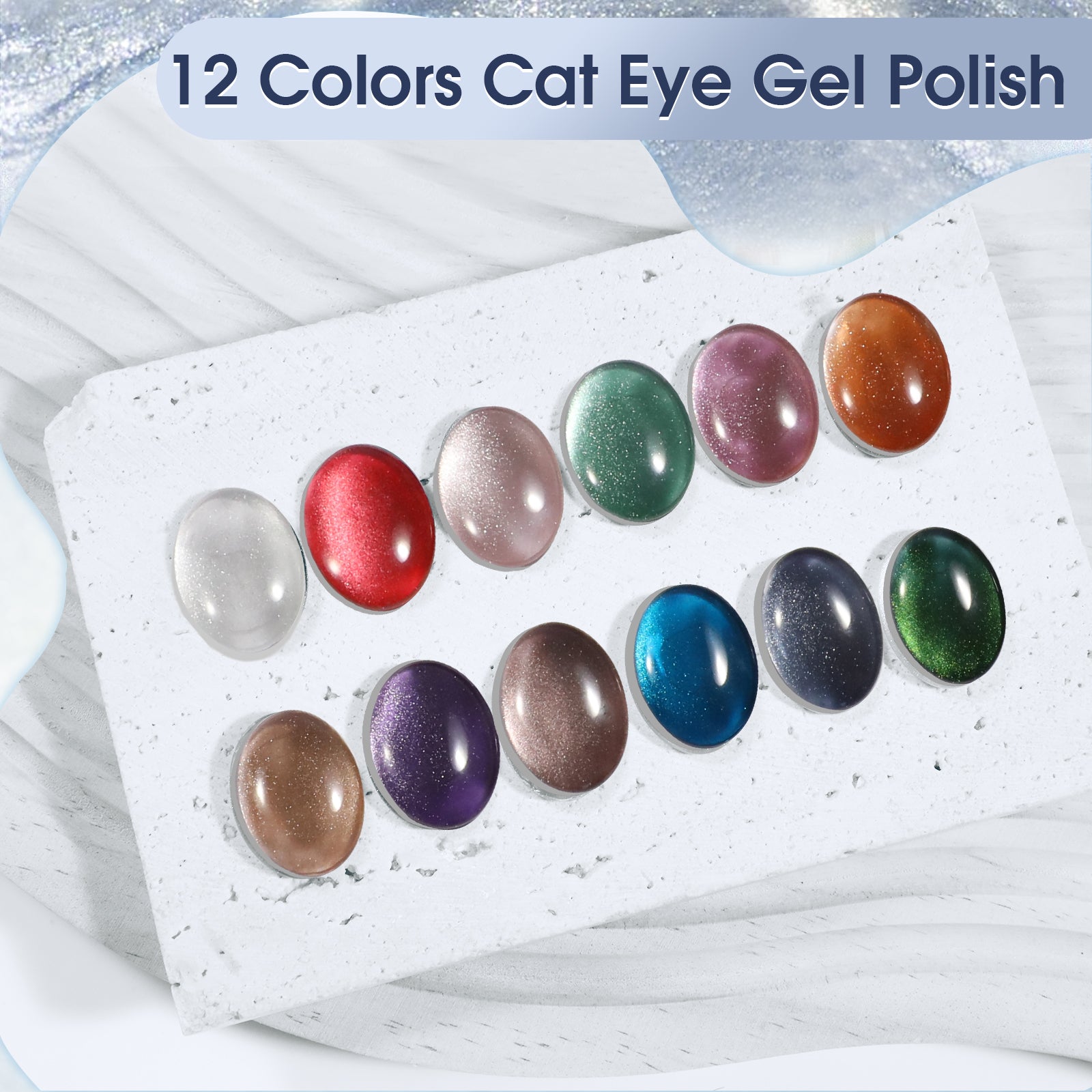 - CHRISTMAS CATEYE GEL POLISH SET: ROSALIND cat eye nail polish - 12 cateye shades (5ml each) for magnetic cat eye effects. Compact bottles (5.6cm H x 2.7cm W) are perfect for travel & trying new colors. Achieve long-lasting gel nails anywhere. IMPORTANT : Magnet included with cats eye gel nail polish.